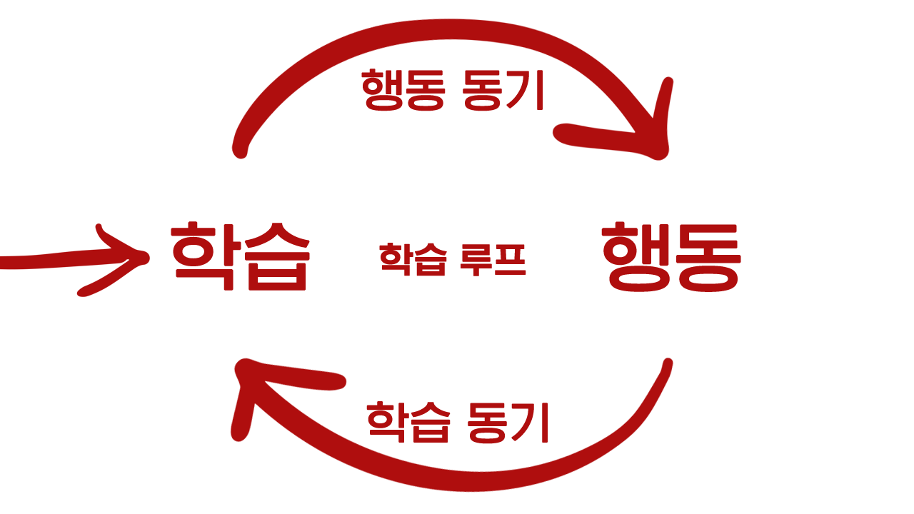 나는 학습 동기가 생기는 원인이 학습된 내용으로 할 수 있는 행동이 있을 때 생긴다 보았고, 위와 같은 모델을 만들고 학습-행동 루프라 이름 붙었다. 학습-행동 루프는 처음에 학습으로 시작한다. 그 후 학습한 내용을 현실에서 사용하고픈 생각이 든다. 그리고 학습 내용을 응용한 행동을 한다. 행동 후 결과를 보고 변화시킬 점이 생각나고, 이는 학습 동기가 되어 다시 학습을 하게 된다. 중요한 점은 이 루프에서 시작은 학습이고, 마지막이 학습 동기라는 점이다. 그리고 중간의 행동이 있지 않으면 이 루프는 지속하지 않는다.