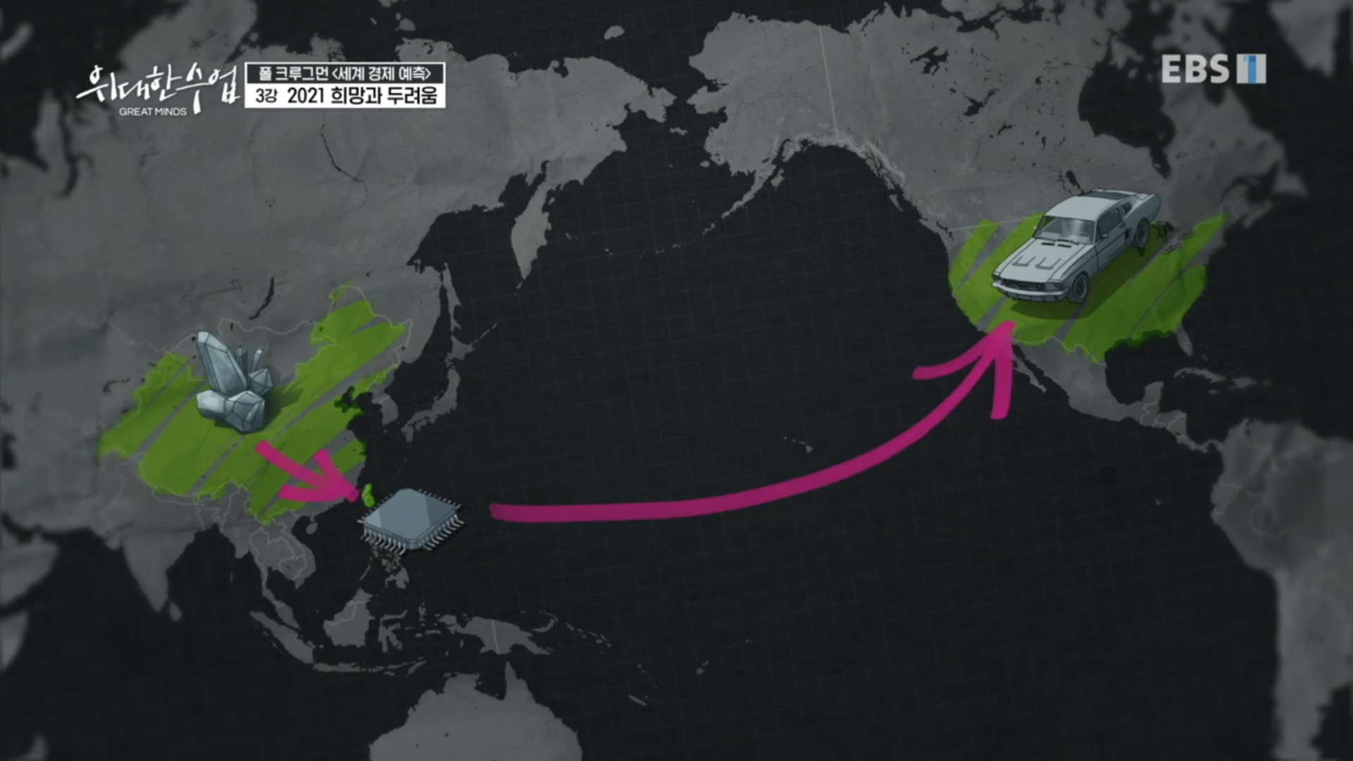 ex) 미국 내에서 자동차를 생산하는데, 대만 반도체 칩에 의존, 중국의 희토류 채굴에 연관