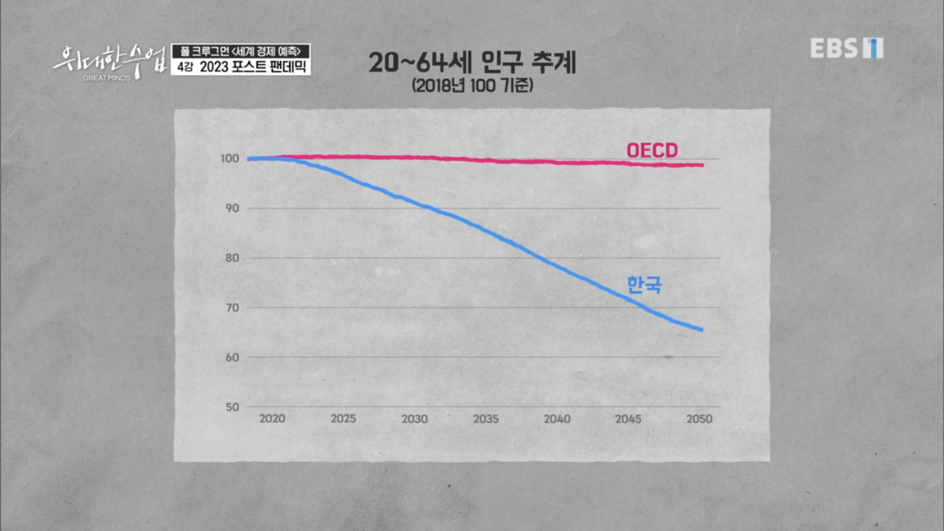 - 향후 20년 동안의 생산 가능이 태어났기 때문에 생산가능 인구 예측 가능. 훨씬 극단적 그래프 예정