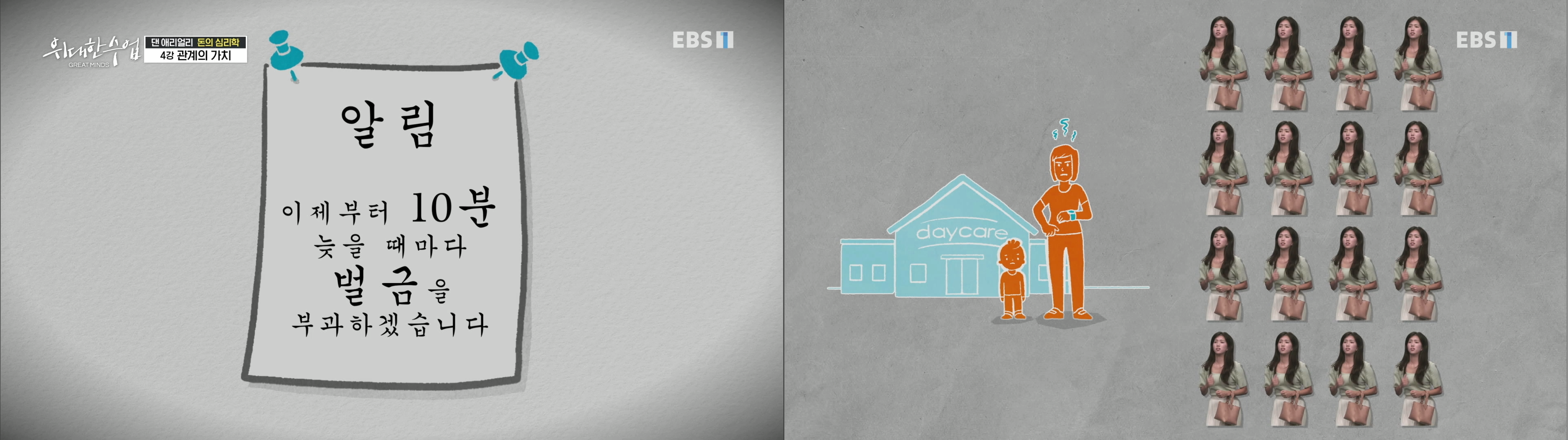 - 하지만 벌금이 생기자 죄책감을 느끼지 않고 그냥 벌금을 냄 ("벌금 내면 두 시간 더 봐줄 수 있죠?")