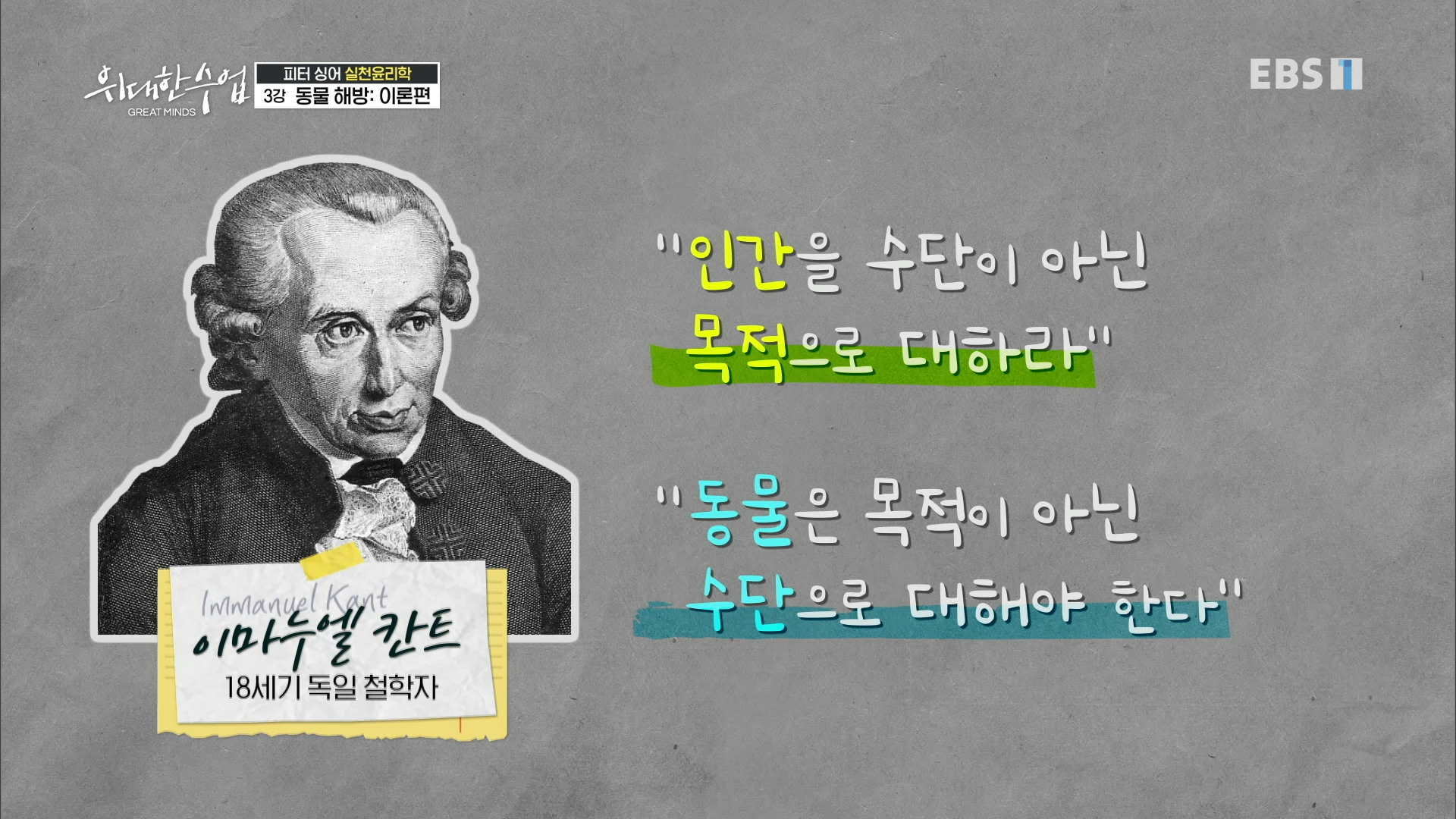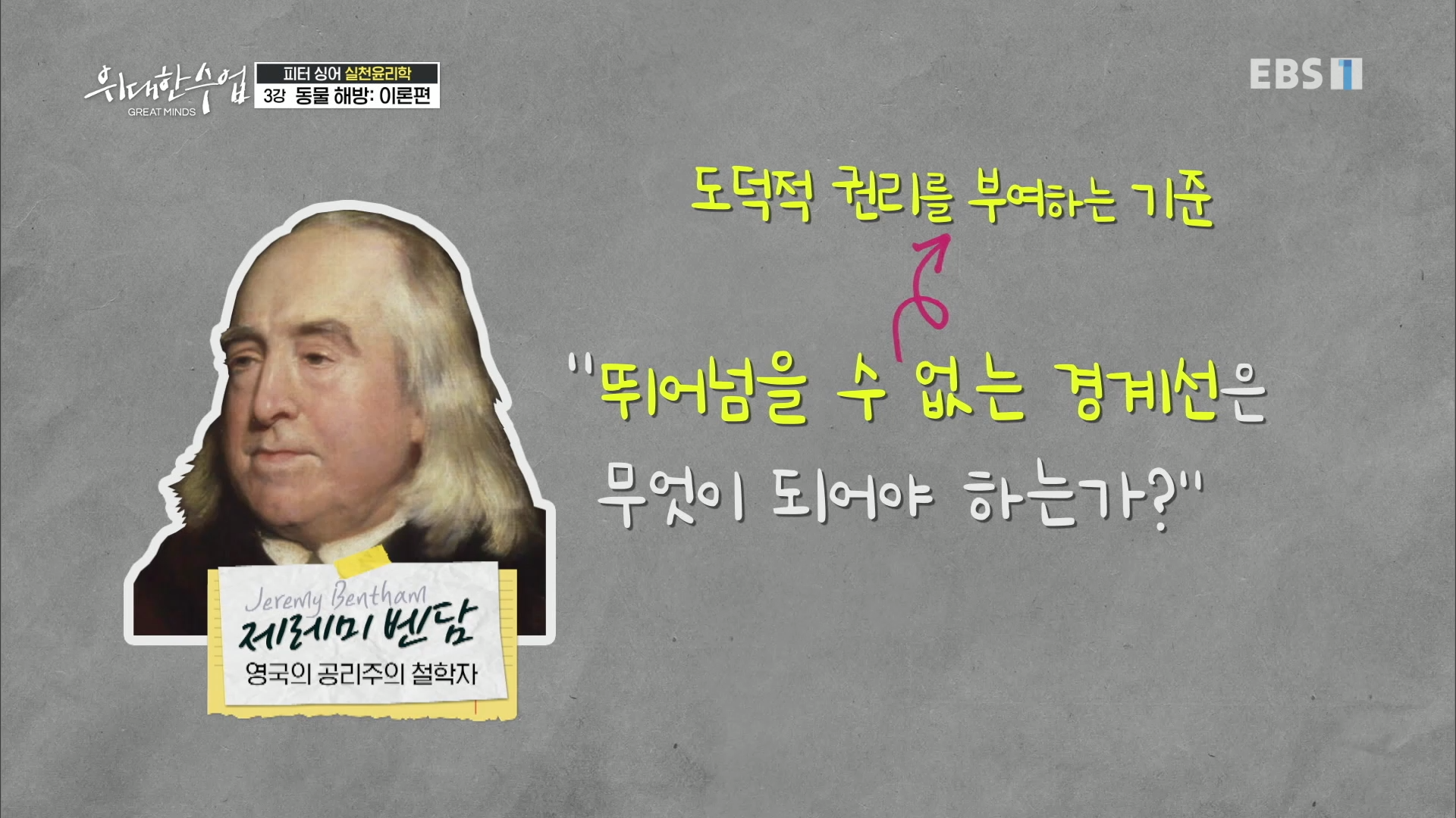 피터 싱어 - 실천윤리학 이전 차시 [위대한 수업 요약] 피터 싱어 - 왜 공리주의인가? 실천윤리학 - 1강. 왜 공리주의인가? 위대한 수업 다시 보기 링크 : https://www.ebs.co.kr/tv/show?prodId=411911&lectId=60..