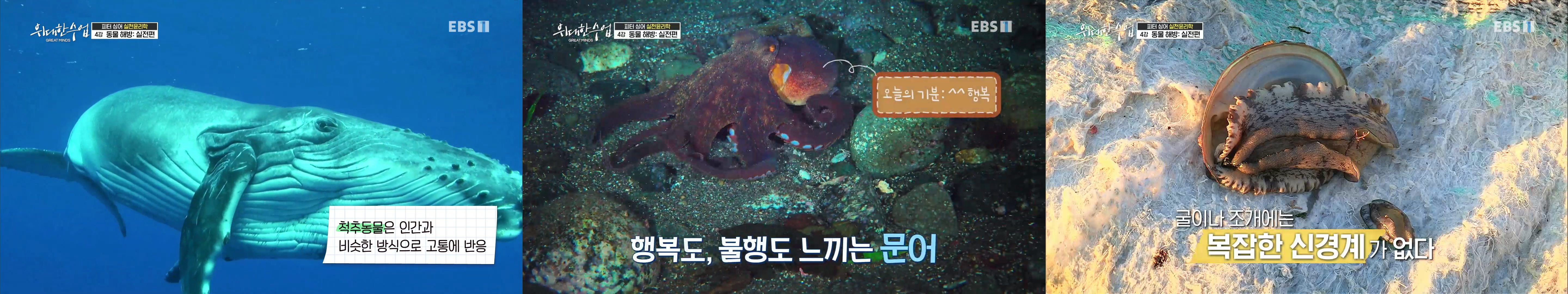- 일부 무척추 동물 : 문어의 복잡한 행동은 의식이 존재함을 알 수 있다. 행복, 불행 느낄 수 있다.