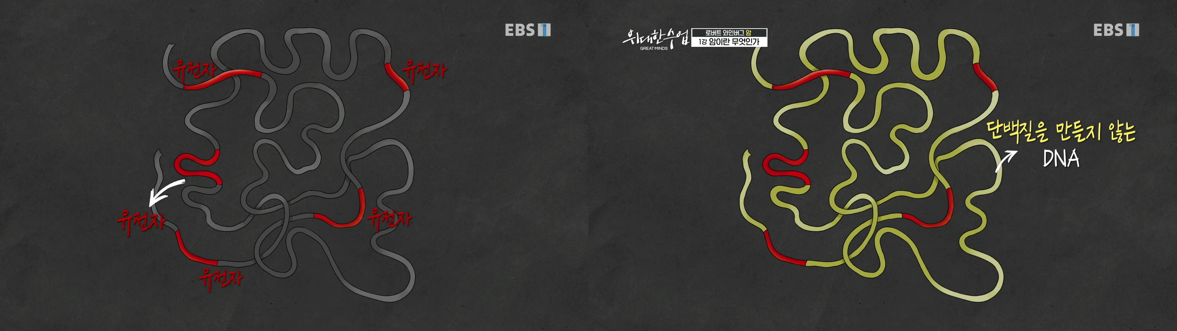 - 유전자 사이에는 단백질 만들지 않고, 세포 행동에 관여 않는 DNA(노란 부분)이 있다