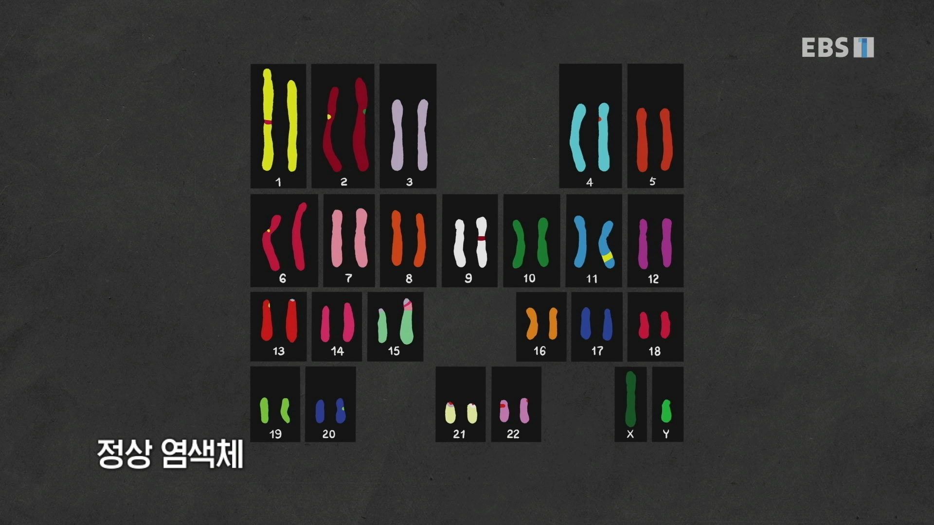 정상 세포 속 염색체 : 46개 쌍, 반은 어머니, 나머지 반은 아버지한테 받아옴