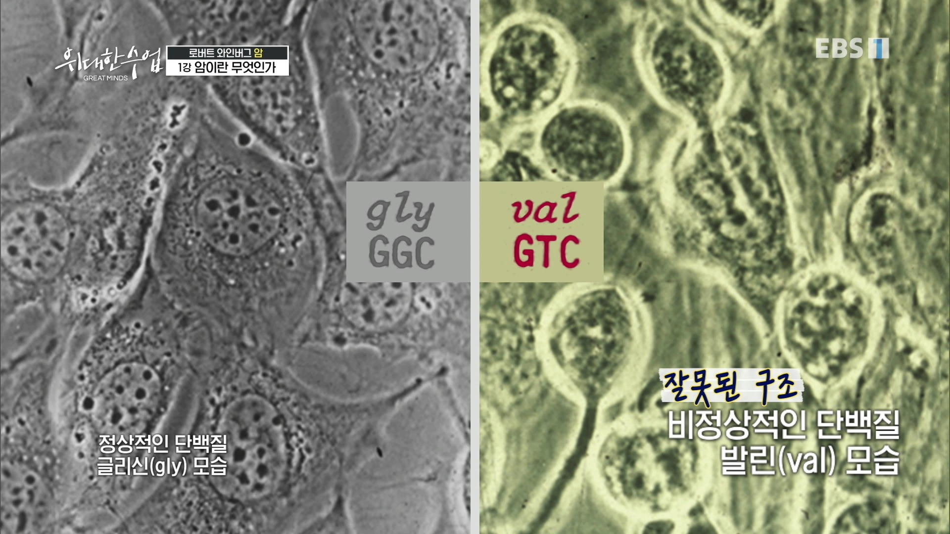 - 왼쪽은 정상으로 글리신이 만들어졌을 때 모습, 오른쪽은 발린이 만들어졌을 때의 모습