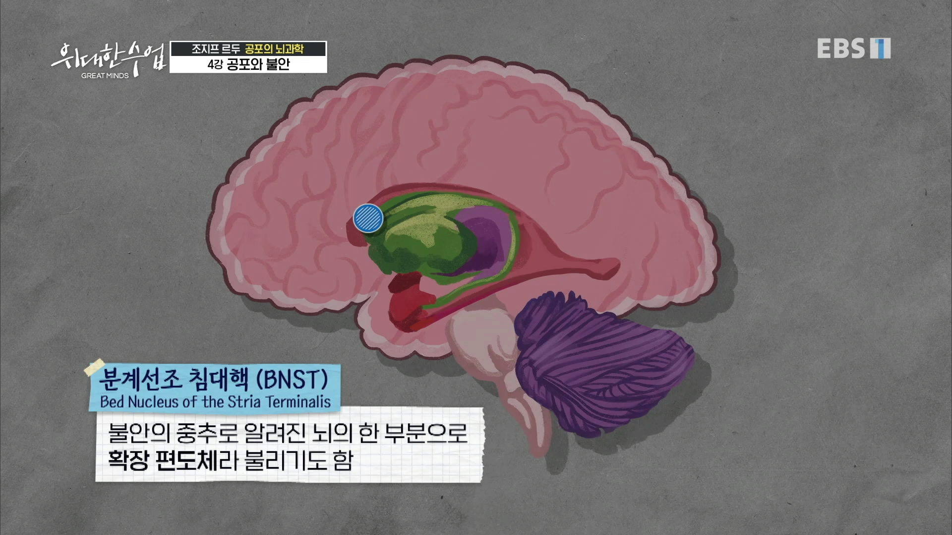 - 분계선조 침대핵(BNST) : 불안의 중추로 알려진 뇌의 한 부분으로 확장 편도체라 불리기도 함