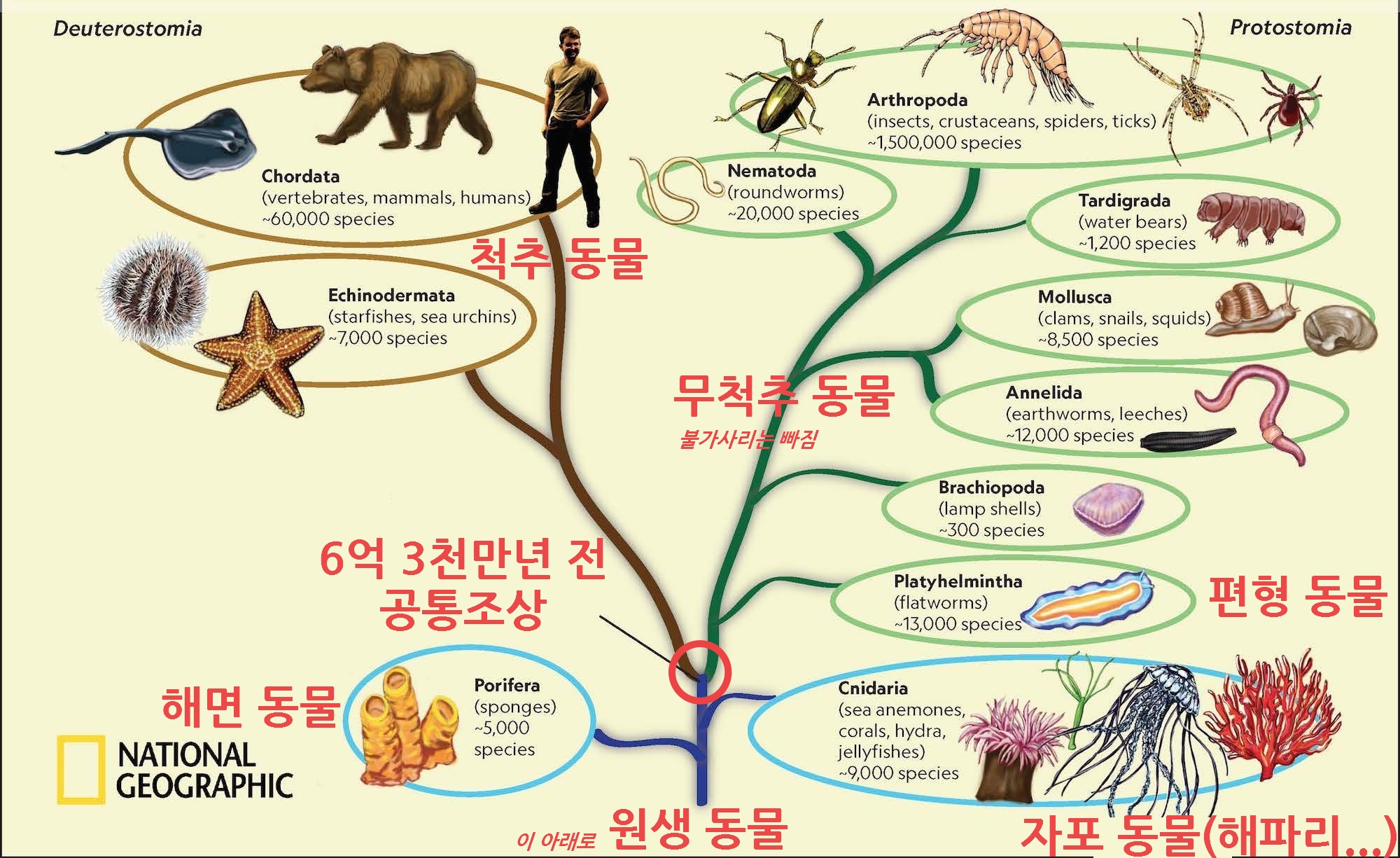 - 6억 3천만년 전 공통 조상에게서 척추 동물, 무척추 동물 두 갈래로 갈라져 나옴