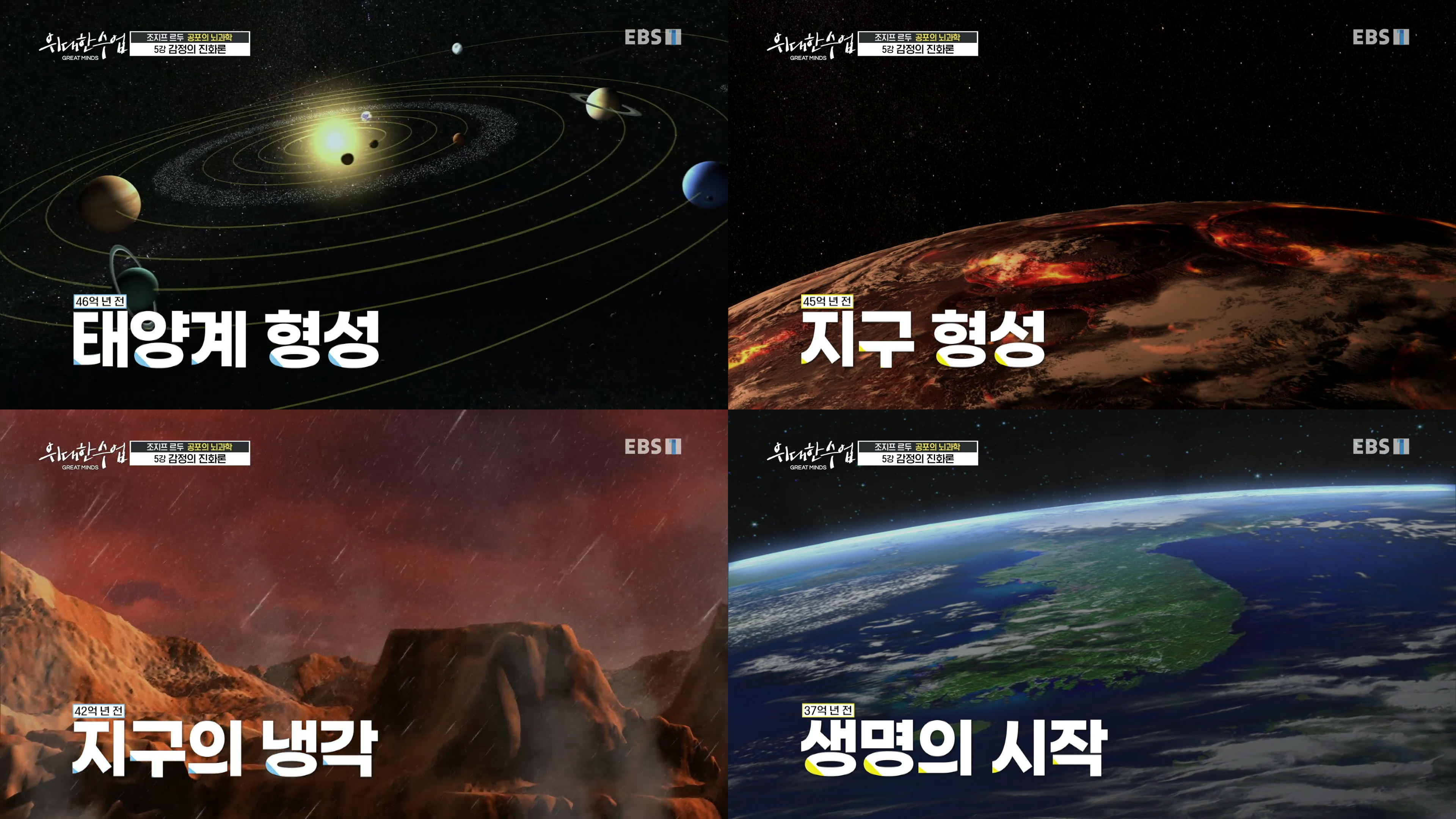 - 137억년 전 빅뱅, 46억년 전 태양계 형성, 45억년 전 지구 생성, 42억년 전 지구가 식음, 37억년 전 생명 시작