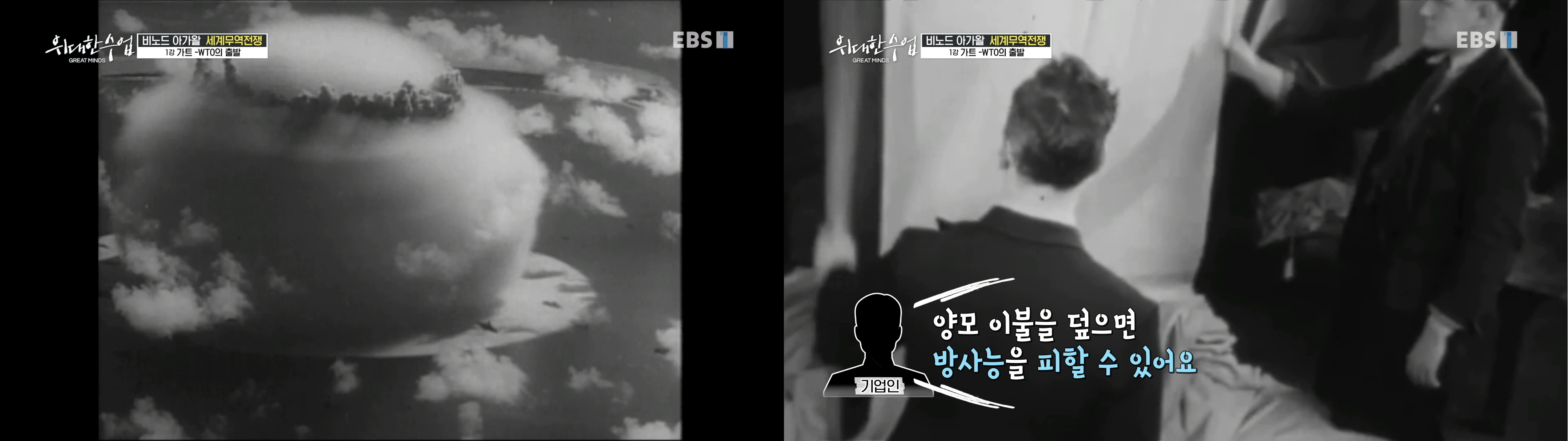 그럼 국내 수준에서는 잘 작동하는 전문화가 왜 국제적인 수준에서는 문제를 일으킬까요? 그 질문에 답을 하자면 국제적인 수준에서는 많은 국가가 경쟁을 하기 때문입니다. 우리가 알다시피 모든 국가가 서로 우호적이지 않고 많은 나라가 수입시 한 나라에만 지나치게 의존하는 걸 가장 우려합니다. 수출 할 때에도 특정국가에만 의존하지 않게 주의하죠. 여기서 핵심은 기업들은 과도한 경쟁을 원치 않는다는 겁니다. 그럼 기업들은.뭘 할까요. 정부의 로비를 하거나 보호를 해 달라고 압박합니다. 그들의 사업이 국가안보에 매우 중요하다고 하는 것이죠. 그래야 다른 기업과 경쟁하지 않을테니까요. 정부에 수입 제안을 요구 하는 겁니다. 예를 하나 들어보죠. 1950년대 사례입니다. 아실지 모르겠지만 1950년대에는 핵전쟁에 대한 두려움이 있었죠. 그리고 미국의 양모 산업은 정부에게 보호를 요청했습니다. 정부에게 이렇게 말했습니다. 안녕하세요. 정부 담당자님. 양모로 만든 이불이 국가안보에 매우 중요하다는 걸 아십니까? 핵전쟁이 벌어지면 양모 이불 덮어야 방사능을 피할 수 있습니다라고 말이지요. 지금은 말이 안 된다는걸 다 알고 있죠. 양모 이불은 방사선을 막을 수가 없습니다. 정책입안자들은 국가안보를 내걸고 산업 보호를 요청하는 기업들의 요구를 매우 조심히 받아들여야 합니다.