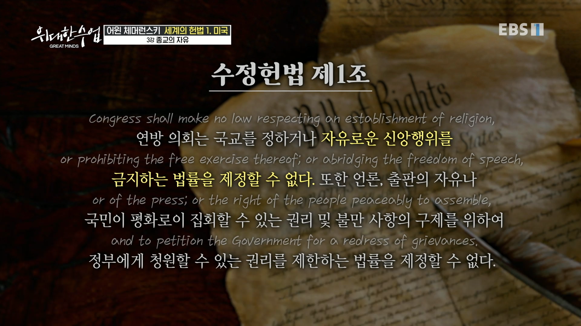 헌법 제정 이전 영국의 식민지와 본토에는 상당한 종교 박해가 존재했습니다. 따라서 1791년 권리장전 초안이 마련됐을 때 미국이 종교의 자유를 보장하는 방식에 상당히 집중한 것은 놀라운 일이 아니었습니다. 수정 헌법 제1조에는 종교의 자유에 관한 조항이 두 가지 있습니다. 하나는 국교 설립에 관한 의회의 법 제정 금지에 관한 조항입니다. 이는 국교 금지 조항으로 알려져 있죠. 다른 하나는 의회가 종교 활동 자유를 제한하는 법의 제정을 금지하는 조항입니다. 이것은 수정헌법 제1조의 종교 행사의 자유 조항이라고도 불립니다. 이제부터 전 국교 금지 조항과 종교 행사의 자유 조항과 관련해 법이 어떻게 바뀌고 진화하는지에 대해 얘기해 보겠습니다.