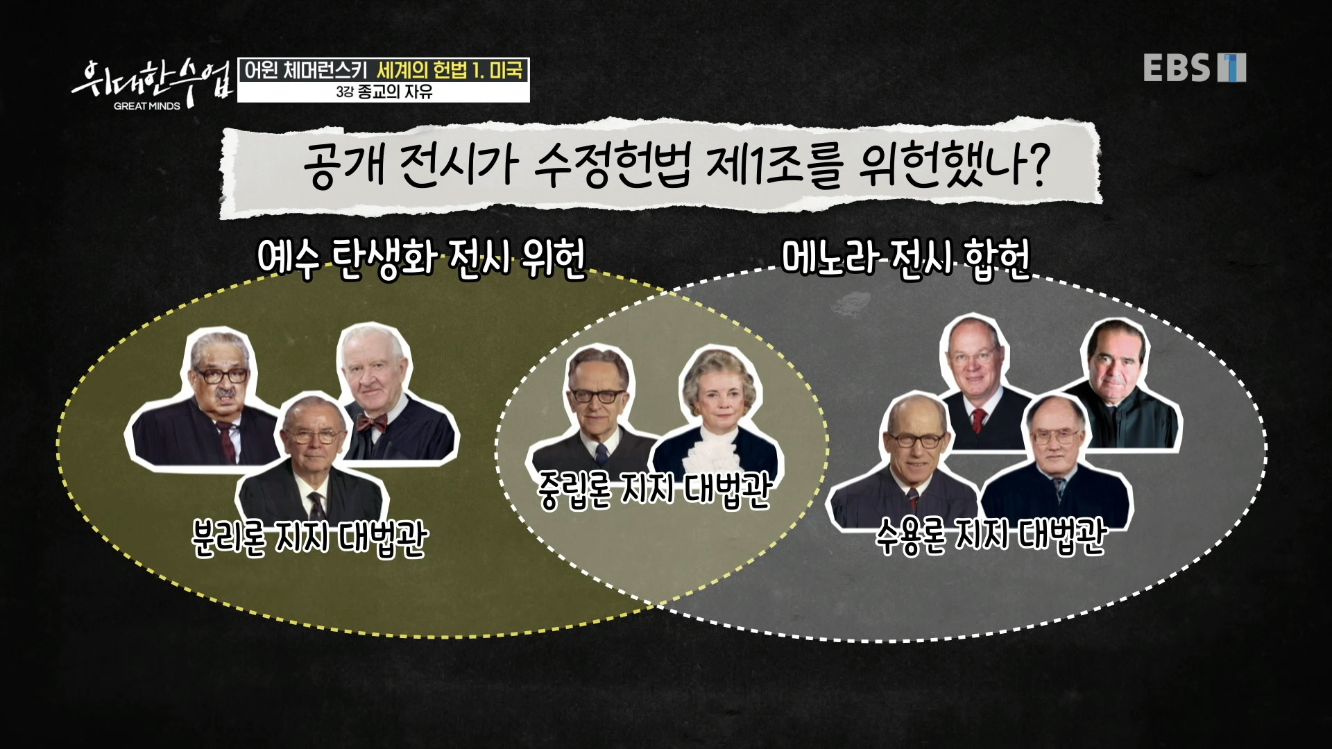 당시 대법원에는 종교 분리를 지지하는 대법관 세 명이 있었습니다. 그들은 종교적 상징물이 정부청사 경내에 있어서는 안 된다고 믿었습니다. 그래서 그들은 예수 탄생화와 메노라 모두 위헌성이 있다고 생각했죠. 하지만 수용론 관점을 지지하는 대법관 네 명은 정부 청사 내 종교적 상징물 설치에 관용적인 입장을 취했습니다. 이들은 예수 탄생화와 메노라 모두 합헌적이라고 판단했죠. 하지만 대법관 두 명이 더 있었고 미 연방 대법원의 대법관은 총 아홉 명입니다. 이들은 예수 탄생화 전시는 특정 종교를 지지한 것으로 볼 수 있지만 메노라는 전체 전시의 일부로 볼 수 있으니 위헌의 소지가 없다고 주장했습니다. 당시 크리스마스 트리도 있었고 연말 연휴 동안 관용의 중요성 관련 표어도 있었죠. 법관들의 표를 모두 더해보면 예수 탄생화의 위헌을 주장하는 법관은 다섯 명, 메노라 전시의 합헌성을 주장하는 법관은 여섯 명입니다. 이 사건으로 제가 하고자 하는 말은 어떤 관점을 지지하느냐가 결과에 큰 영향을 미친다는 겁니다.