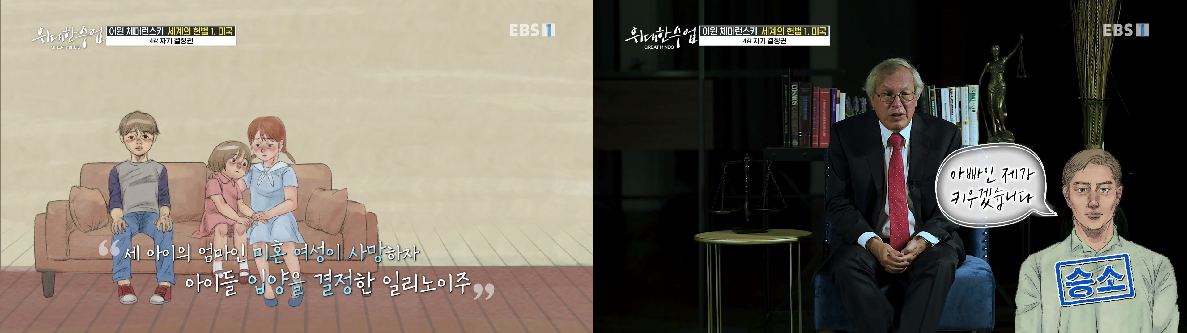 자기 결정권과 관련해 보장되는 세 번째 권리는 자녀 양육권입니다. 정부는 부모의 학대나 방치와 같은 충분한 이유가 있을 때만 부모에게서 자녀를 영구적으로 떼어 놓을 수 있습니다. 다시 한번 대표적인 대법원 판결을 소개하죠. 50년 전 스캔리 대 일리노이주 사건의 판례입니다. 일리노이 주에는 미혼모가 사망하거나 아플 때 감옥에 가는 등 더는 자녀를 양육할 수 없을 때 자녀를 자동으로 입양시키는 법이 있었습니다. 일리노이주의 한 여성은 미혼 상태에서 한 남자와 낳은 자녀 세 명을 키우고 있었습니다. 그녀가 사망하자 일리노이주는 그 자녀들의 입양을 결정했습니다. 그러자 아버지가 자신의 권리를 주장하고 나섰습니다. 연방 대법원은 그의 손을 들어주었죠. 대법원은 모든 부모는 자녀 양육의 권리를 갖고 있으며 정부는 긴박할 필요가 있을 때만 양육권을 박탈할 수 있다고 판결했습니다. 하지만 절대적 권리는 아닙니다. 만약 부모가 자녀를 학대 혹은 방치할 경우 주 정부가 양육권을 박탈할 수 있습니다. 그게 아니라면 부모는 자신의 자녀를 양육할 권한이 있죠.